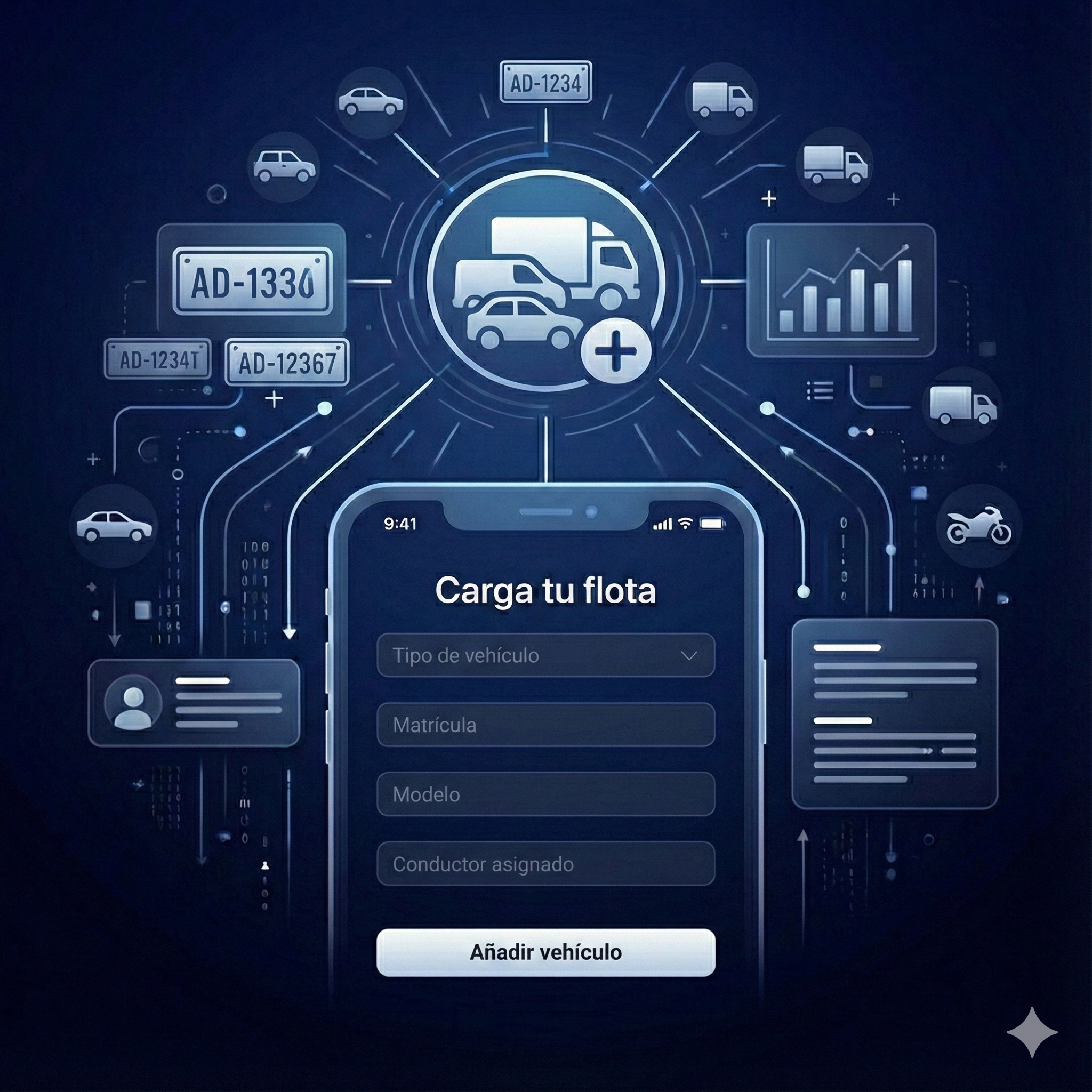 Añade tus vehículos, conductores y datos clave de tu negocio. La plataforma se adapta a tus necesidades.
