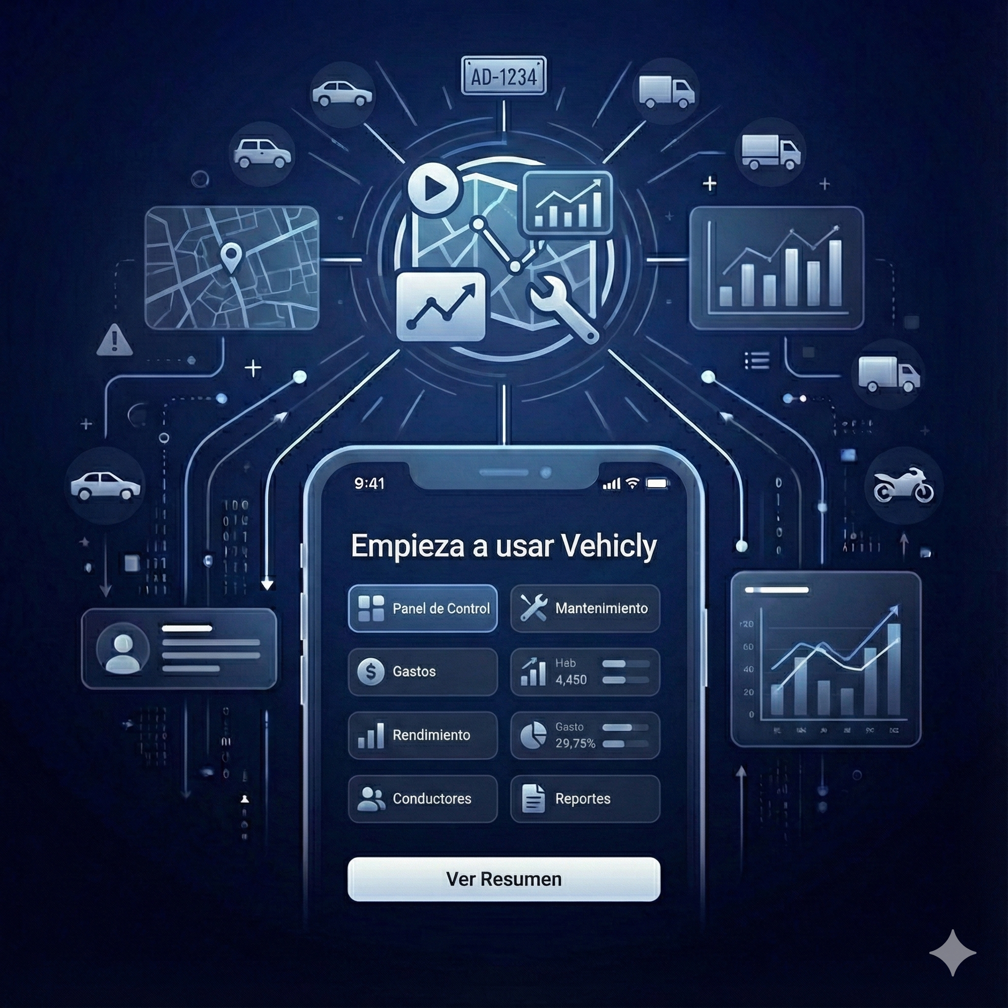 Vehicly es una plataforma de gestión automotor para empresas, pensada para simplificar el control de vehículos, conductores y tareas clave de tu vida. Desde mantenimiento y reparaciones hasta reporte inteligentes, todo en un mismo lugar.
